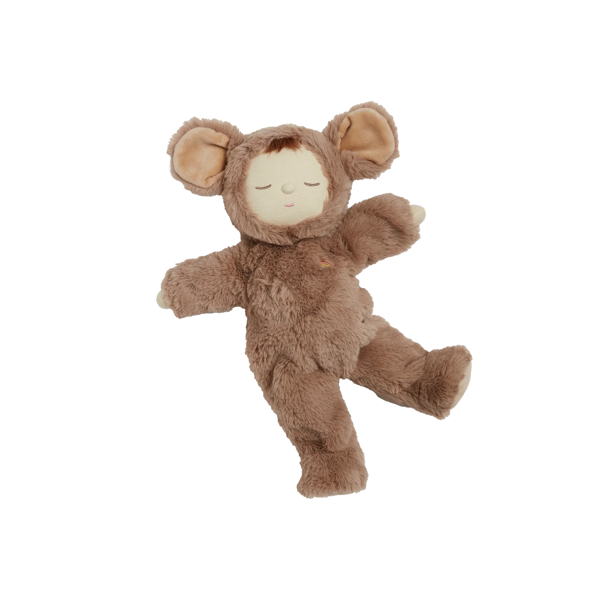 Mousy Pickle is posable, made from the plushest outer and features the sweetest embroidered face with a little tuft of hair. Each Cozy Dinkum wears a non-removable suit with two soft furry ears and a rainbow right over their heart.
