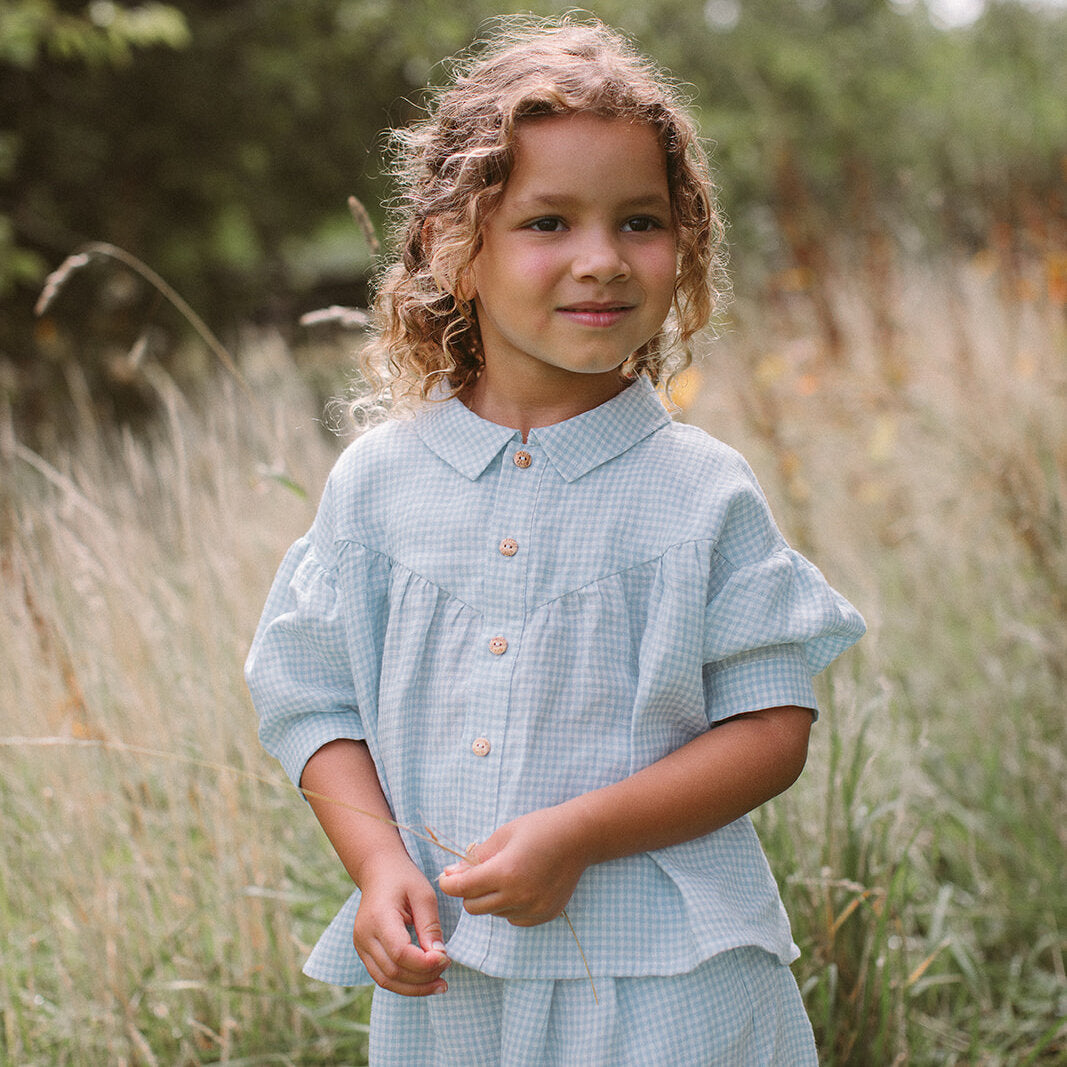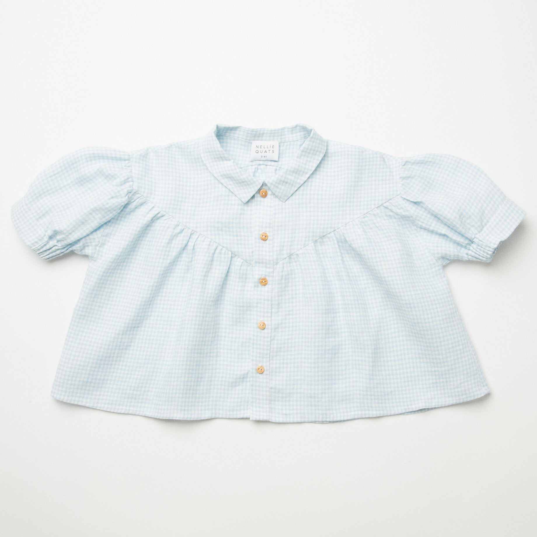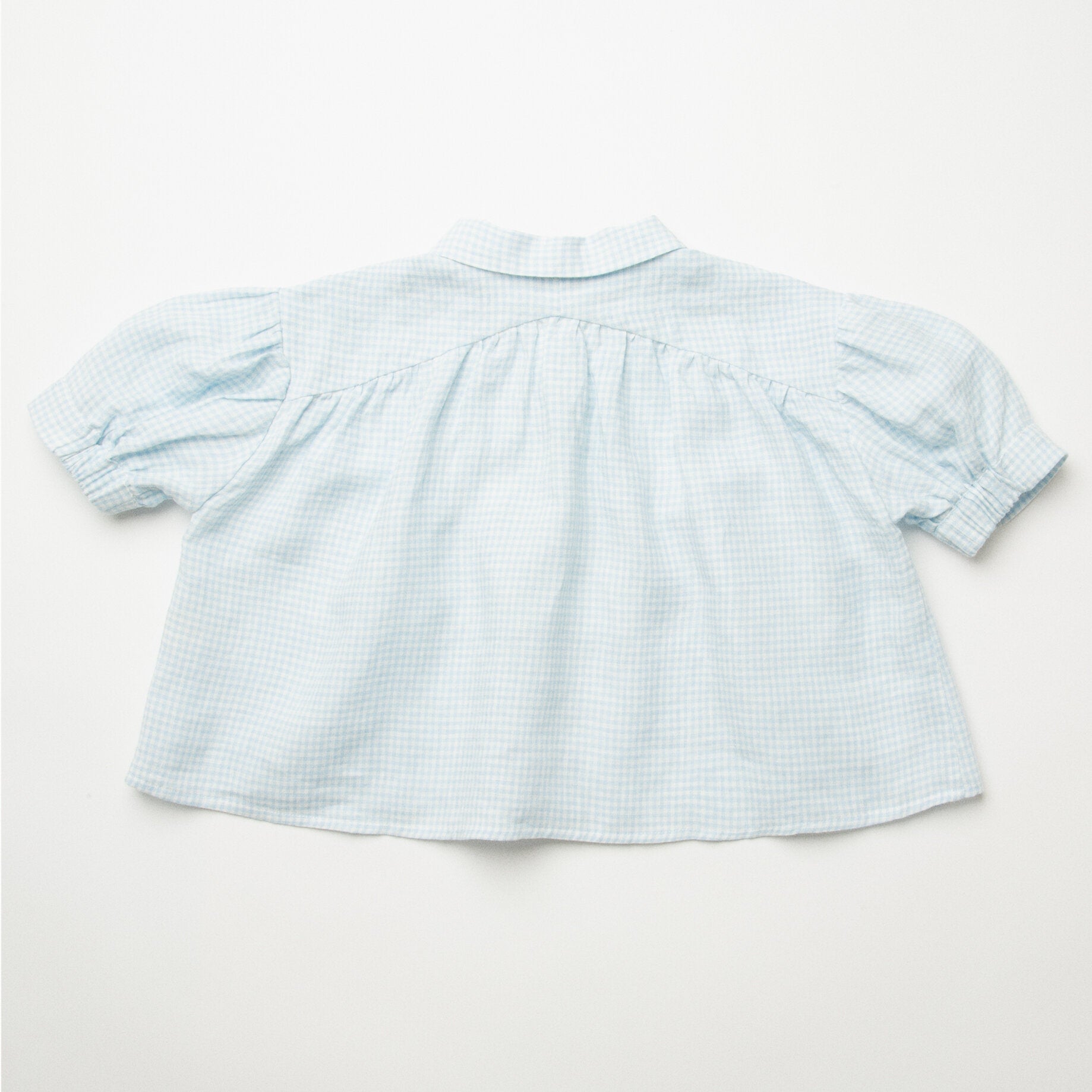 High V-shaped empire line gathers into a loose fit, flowing blouse, with medium length puffed sleeves, half fixed, half elasticated cuffs and sweet flat collar. Wooden buttons run down the front of the blouse to open. Made from beautifully soft, baby blue & oat mini check linen - a light blue and clean white colour linen woven together in a small check.