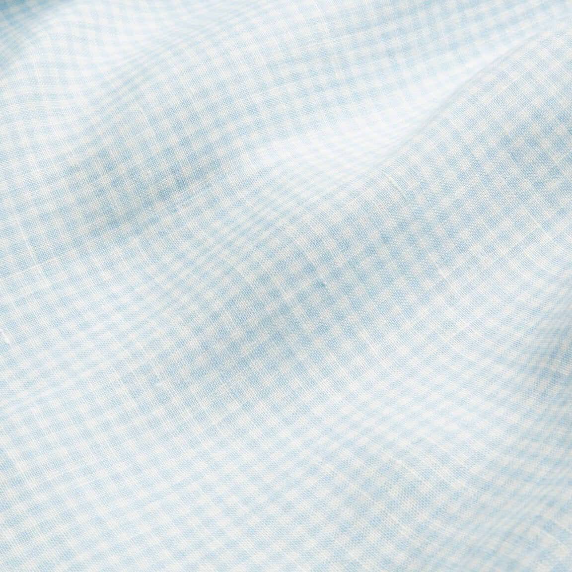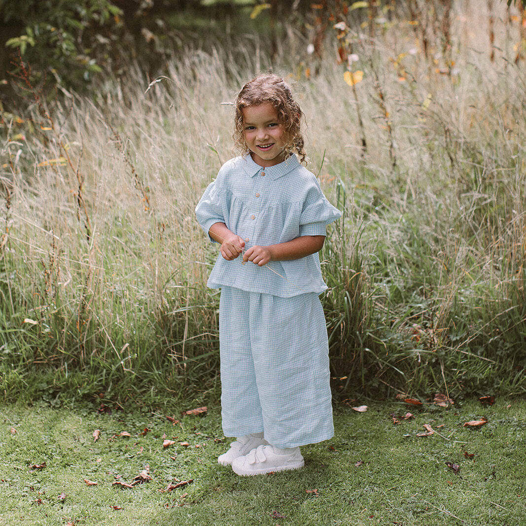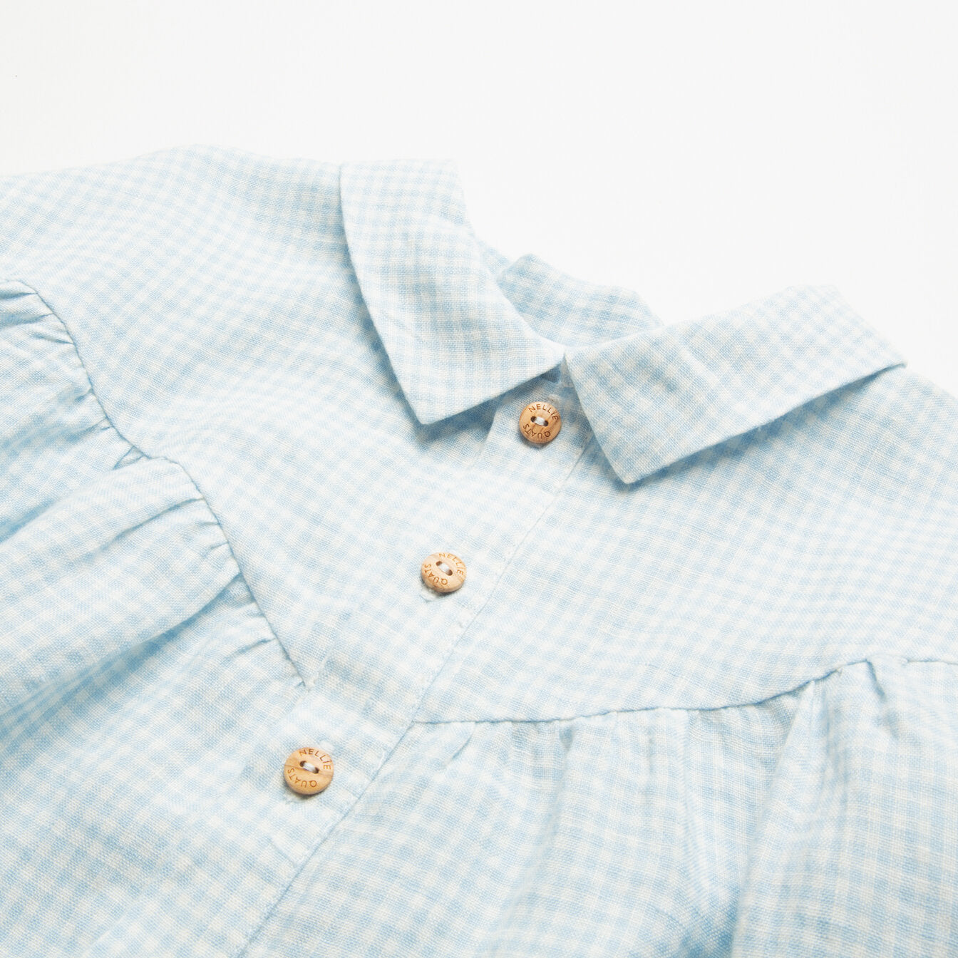 High V-shaped empire line gathers into a loose fit, flowing blouse, with medium length puffed sleeves, half fixed, half elasticated cuffs and sweet flat collar. Wooden buttons run down the front of the blouse to open. Made from beautifully soft, baby blue & oat mini check linen - a light blue and clean white colour linen woven together in a small check.