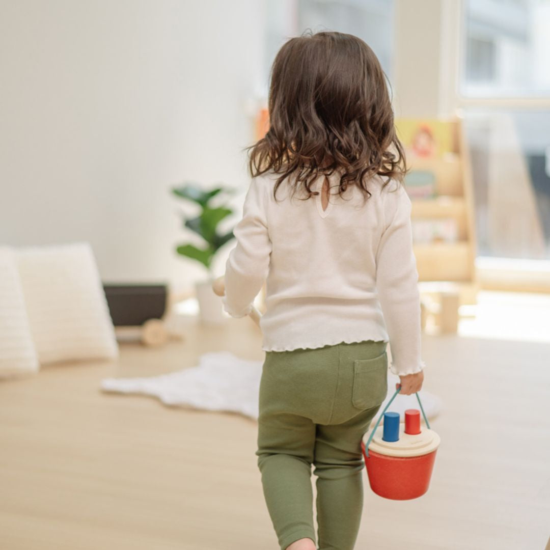 "Designed to develop fine and gross motor skills, this toy encourages children to hammer pegs into the bucket, enhancing grip control, hand-eye coordination, and spatial awareness. As the pegs disappear from sight, children learn about object permanence and are prompted to lift the lid to retrieve them, reinforcing problem-solving and trial-and-error learning. The toy also introduces basic shapes, helping children grasp, rotate, and fit them into the corresponding holes. It fosters analytical thinking, cause and effect, and confidence-building through hands-on play, aligning with Montessori principles. Set includes: 1 bucket with a lid featuring 2 holes, 2 pegs (red and blue), and 1 hammer."