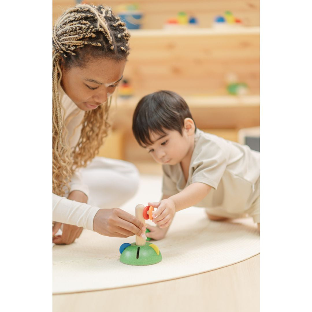 "This unique stacking toy challenges children to interact with traditional stackers in a new way. Featuring a horizontal stacker rod, it helps refine hand movements, wrist rotation, and coordination. The base includes a coin slot for added engagement, strengthening fine motor skills and hand-eye coordination. Children remove the rings and thread them onto the horizontal post, improving finger control and bilateral hand use. Once completed, they can slide the rings off and drop them into the base’s storage slot, reinforcing problem-solving and cognitive development. This activity promotes grip adjustment, cross-body movement, and early concepts of counting, direction, and sequencing, stimulating both brain hemispheres for balanced coordination. Set includes: 1 wooden base with a post and 5 colorful rings."