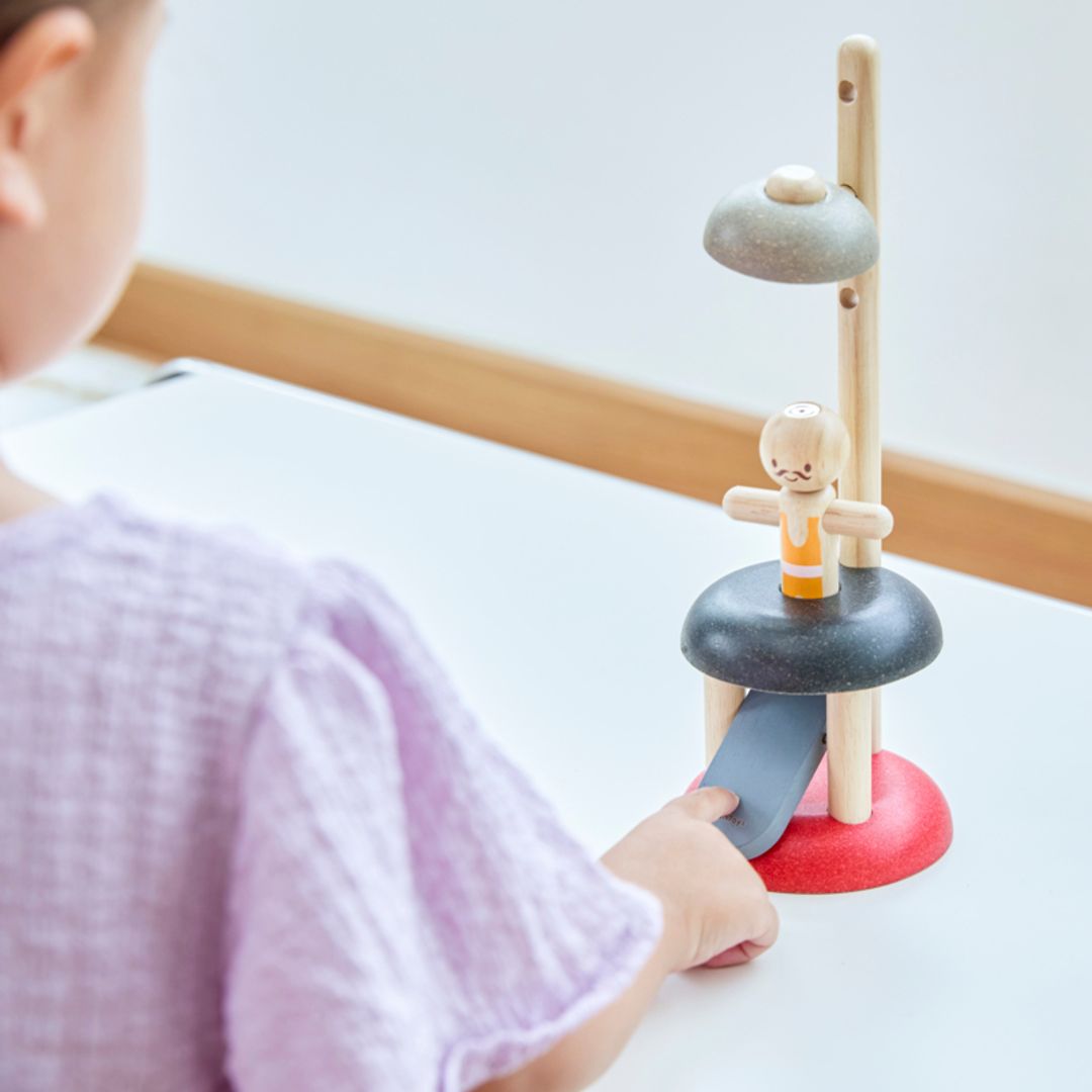 - Teaches cause and effect as children press the wooden stick and watch the acrobat leap.