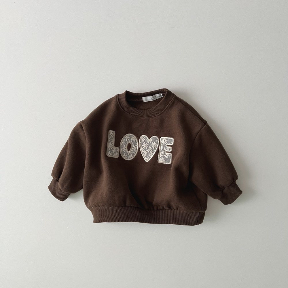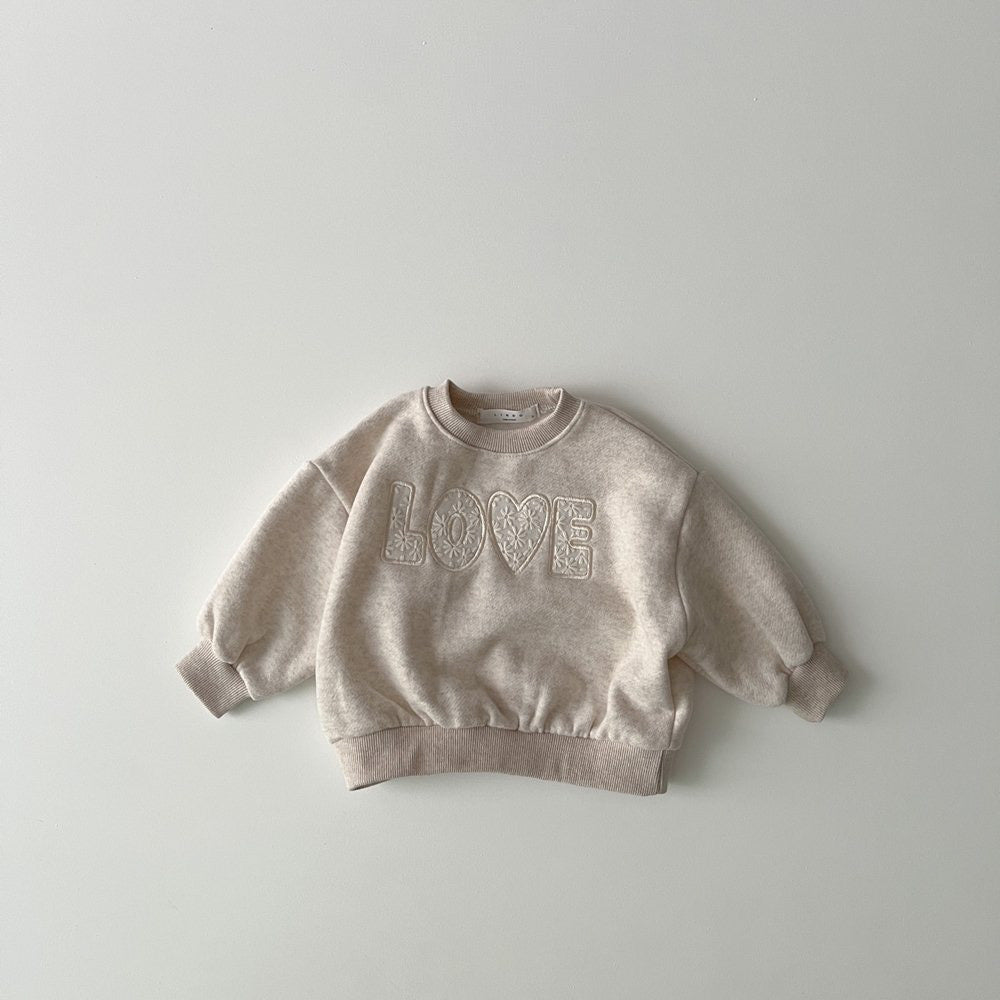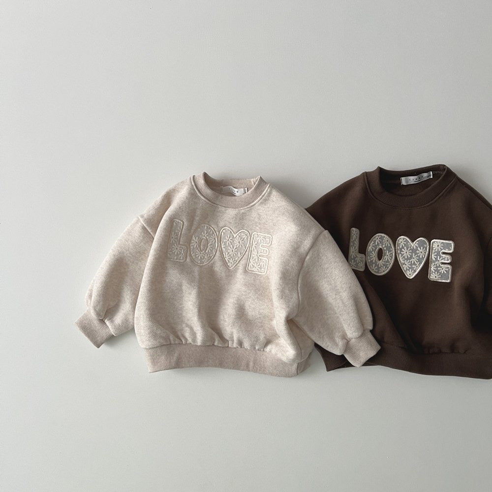 Spread love and style with our Love Sweatshirt! Featuring a lace fabric "love" design, this sweatshirt is both comfortable and eye-catching for kids. Perfect for spreading joy and warmth on chilly days.