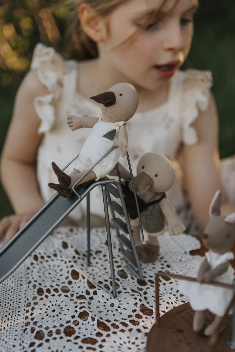 Create endless playtime adventures with the Toy Metal Slide, perfectly scaled for the Rugaroo miniature kangaroo, koala, platypus, and wombat dolls. Inspired by classic Aussie playgrounds, this charming slide brings a touch of nostalgia and open-ended fun to your child’s Rugaroo Wilds collection.