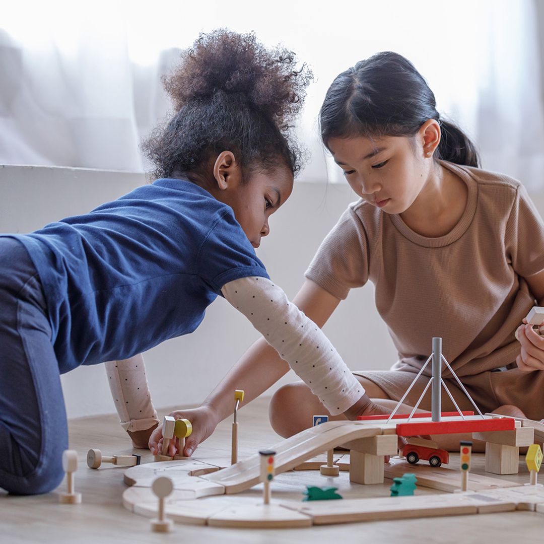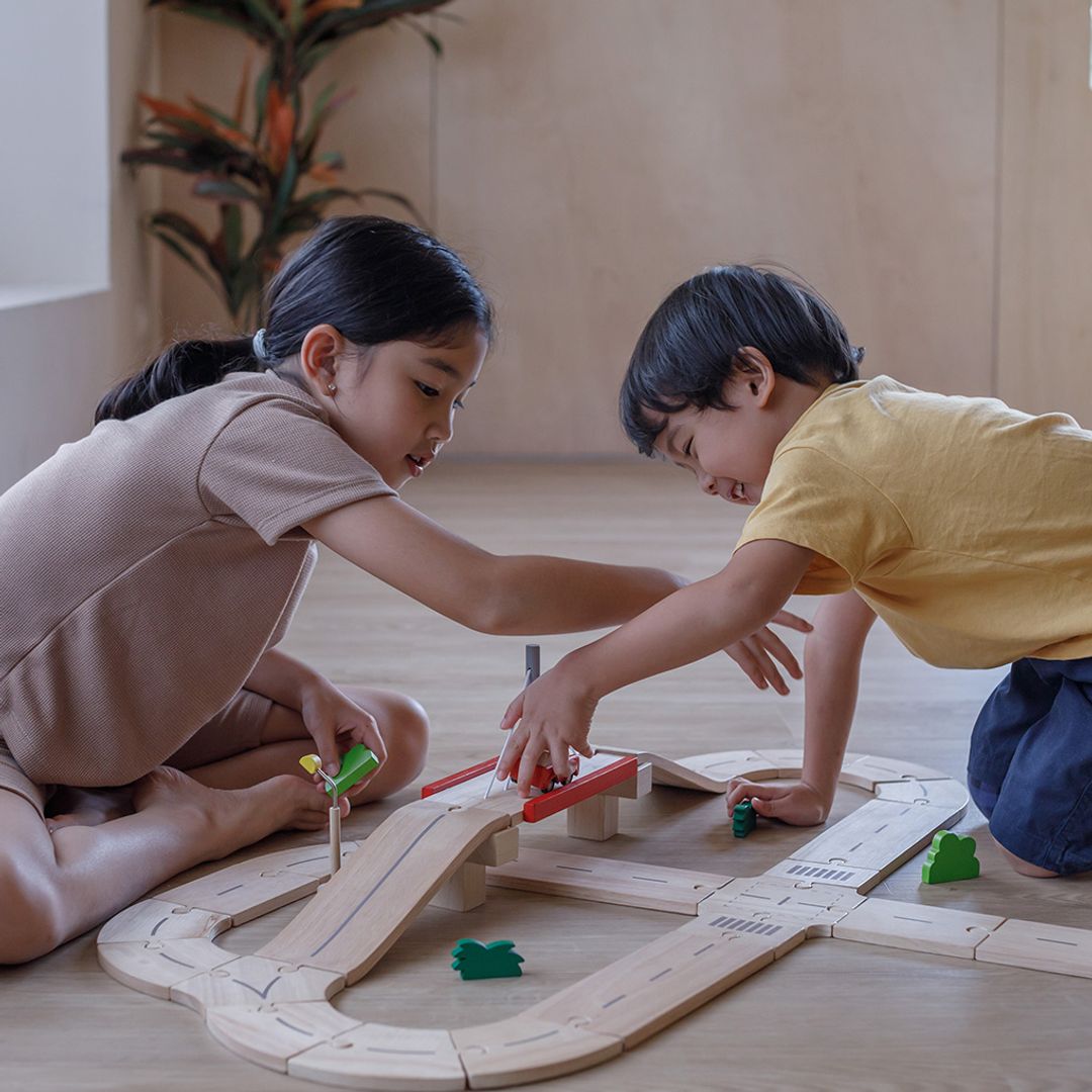 Enhance your pretend-play transportation system with the Road System set! Complete with 27 tracks, 1 bridge, 1 car, 1 lights, and 4 bushes (34 pieces in total), children have everything they need to bring their pretend city to life.