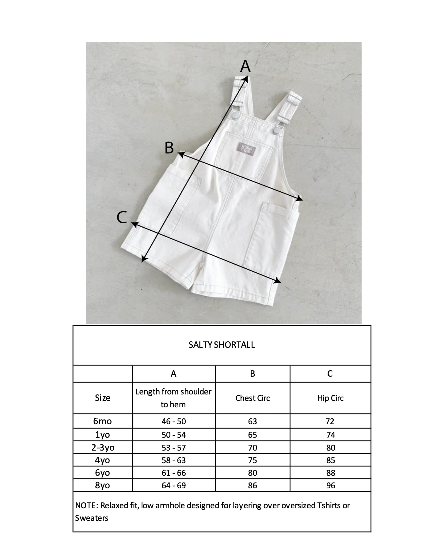 Our Kids Salty Shortall is designed to be loose & easy to throw over Tshirts or Sweaters with the an oversized low scooped armhole. Features oversized pockets & adjustable straps to allow your little one to grow & move.