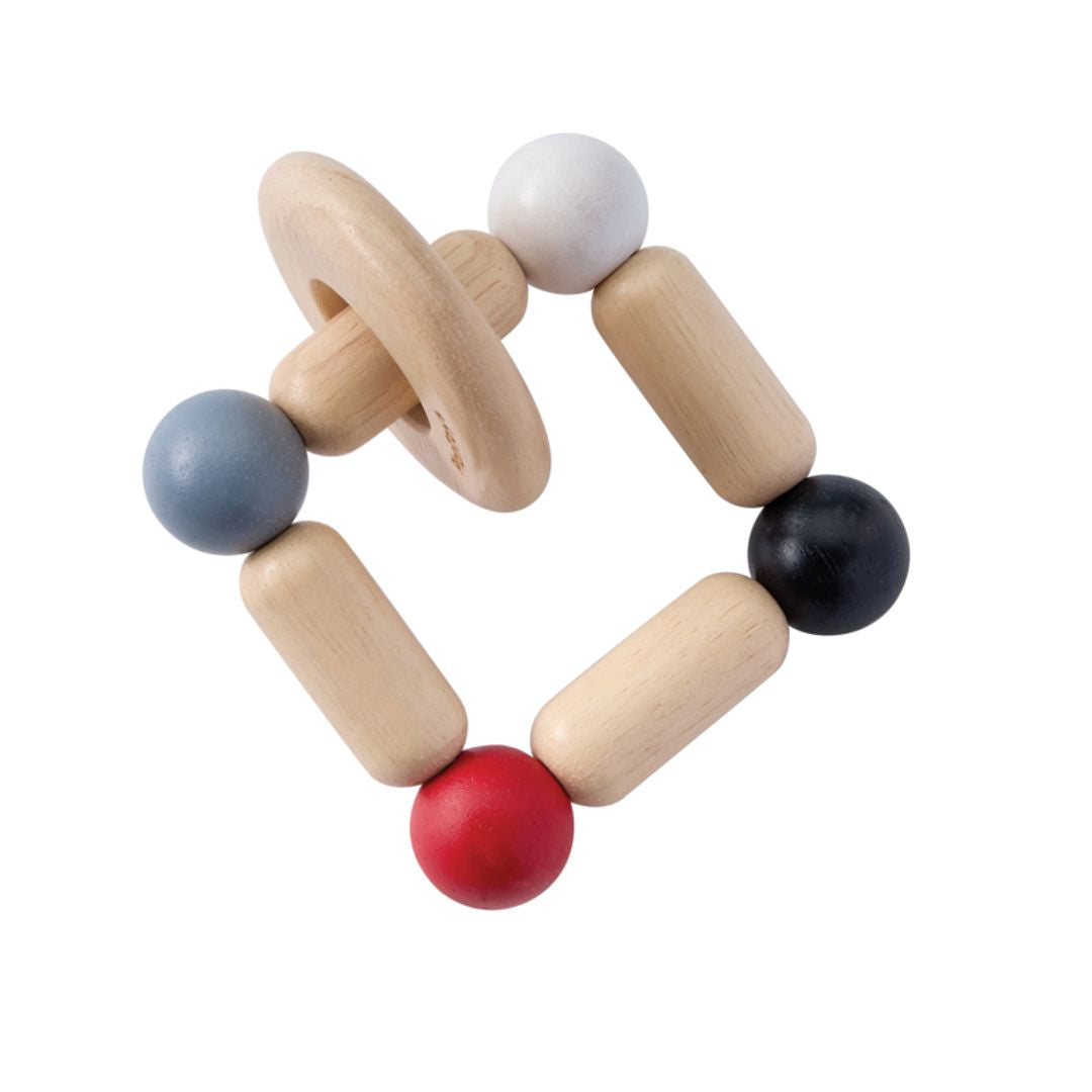 This is a flexible, square-shaped wooden toy featuring colorful red, white, black, and gray beads that slide and rattle. As babies grip and squeeze its bendable frame, it helps develop fine motor skills and hand-eye coordination. The rattling sounds support auditory development, while the toy encourages tactile exploration, bilateral coordination, and cognitive growth through cause-and-effect learning, offering complete sensory stimulation. High-contrast colors are especially beneficial for young babies, as they are easier to see and help develop visual focus.