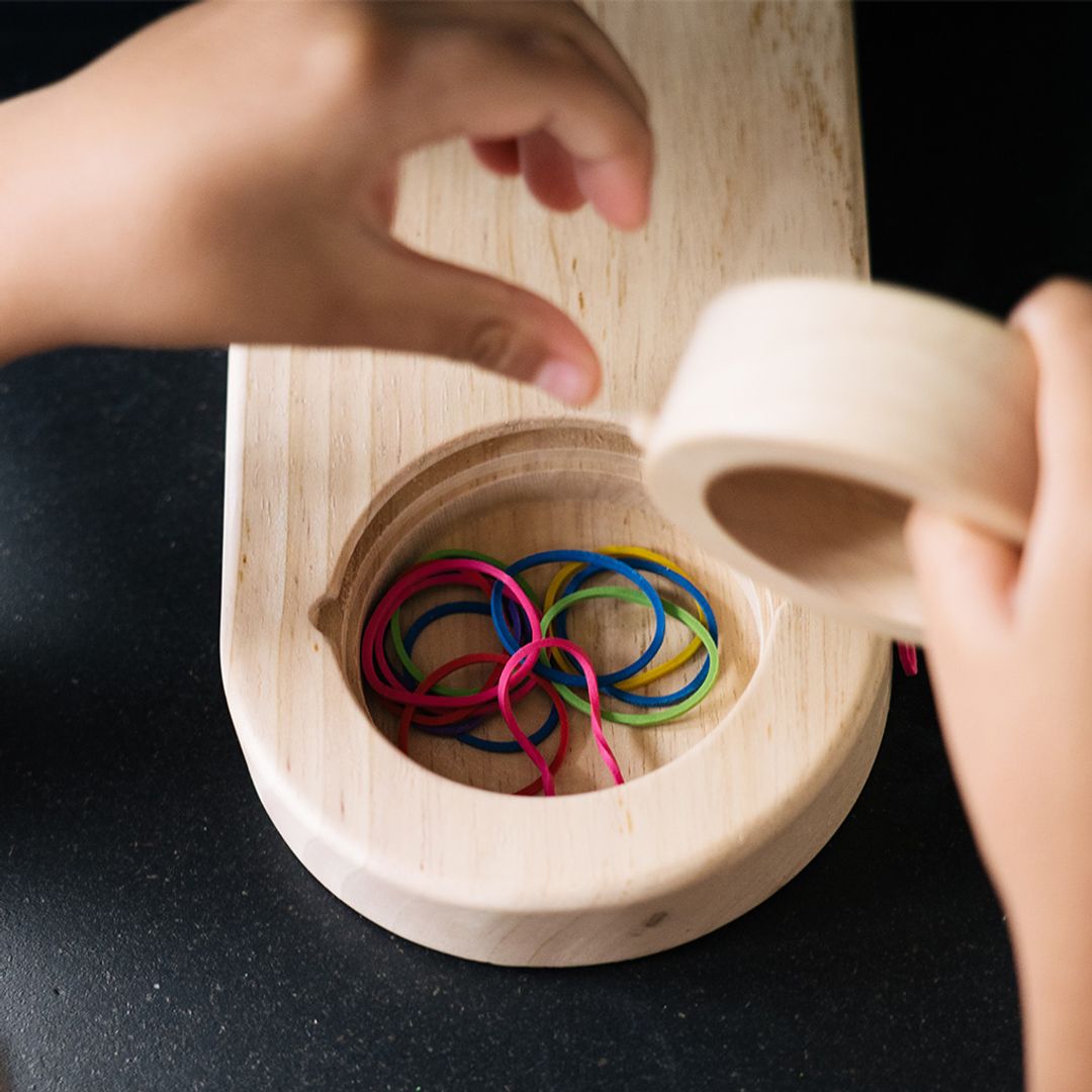 The PlanToys Wall Ball Game is a game of concentration and skill. Children can set the course difficulty using rubber bands and chalk to create obstacles that they must overcome to bring the ball from the bottom to the goal by skillfully pulling and releasing the pulleys to move the ball up the wall.